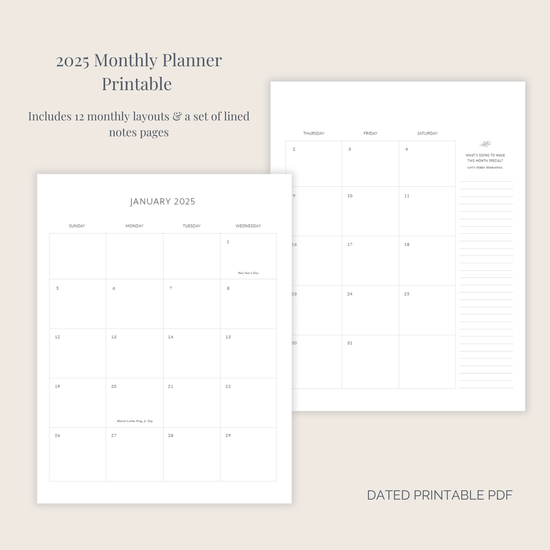 Stay organized and on track with the 2025 Monthly Planner Printable. Get 12 monthly layout pages plus a set of note pages to track the year's goals and big-picture plan.