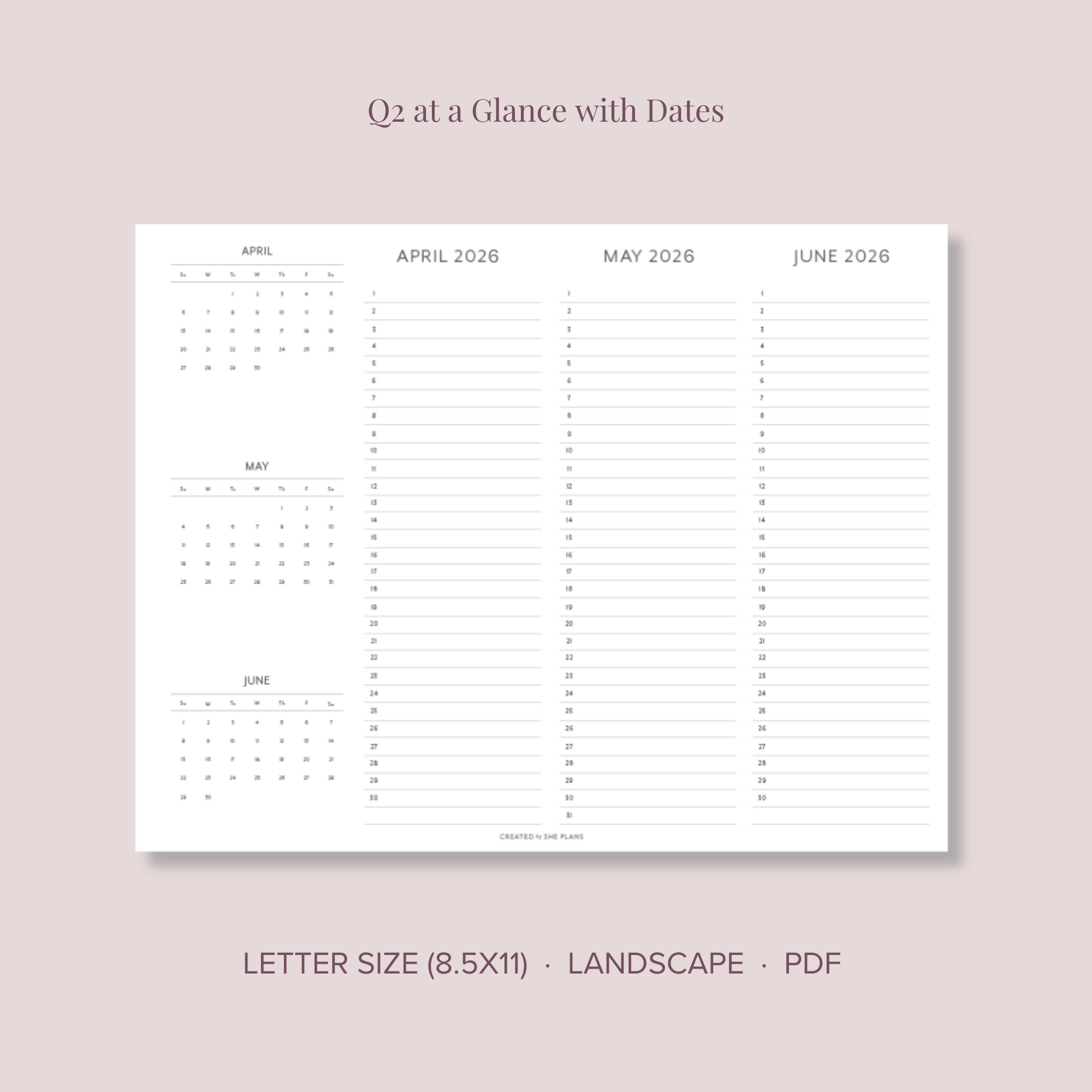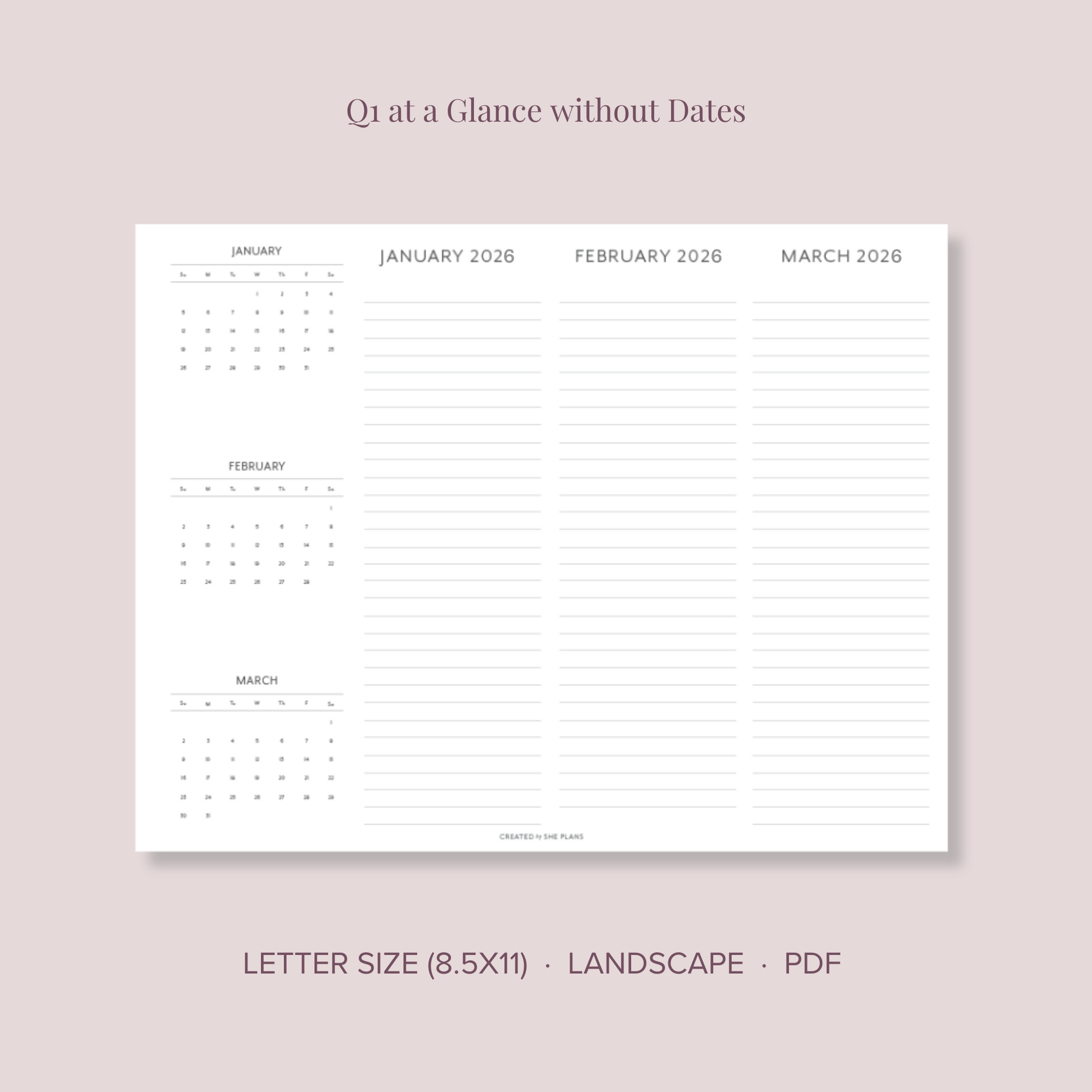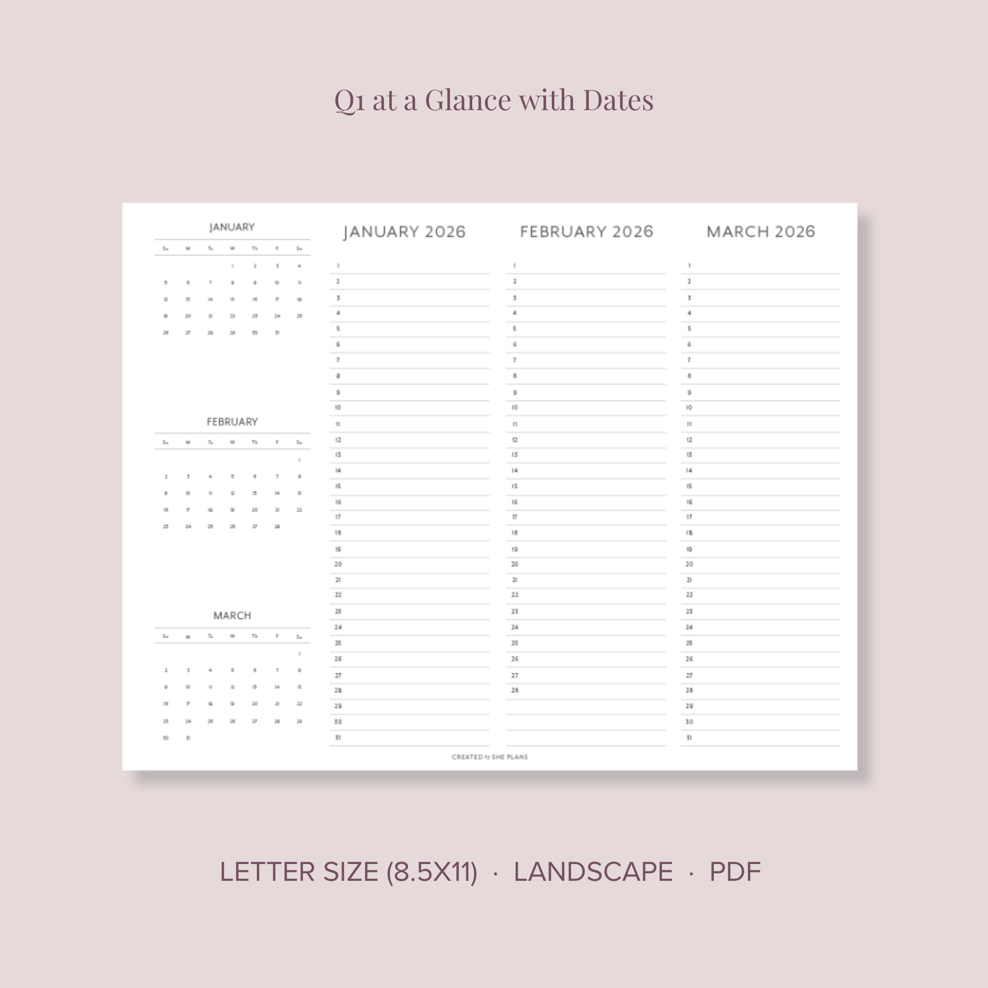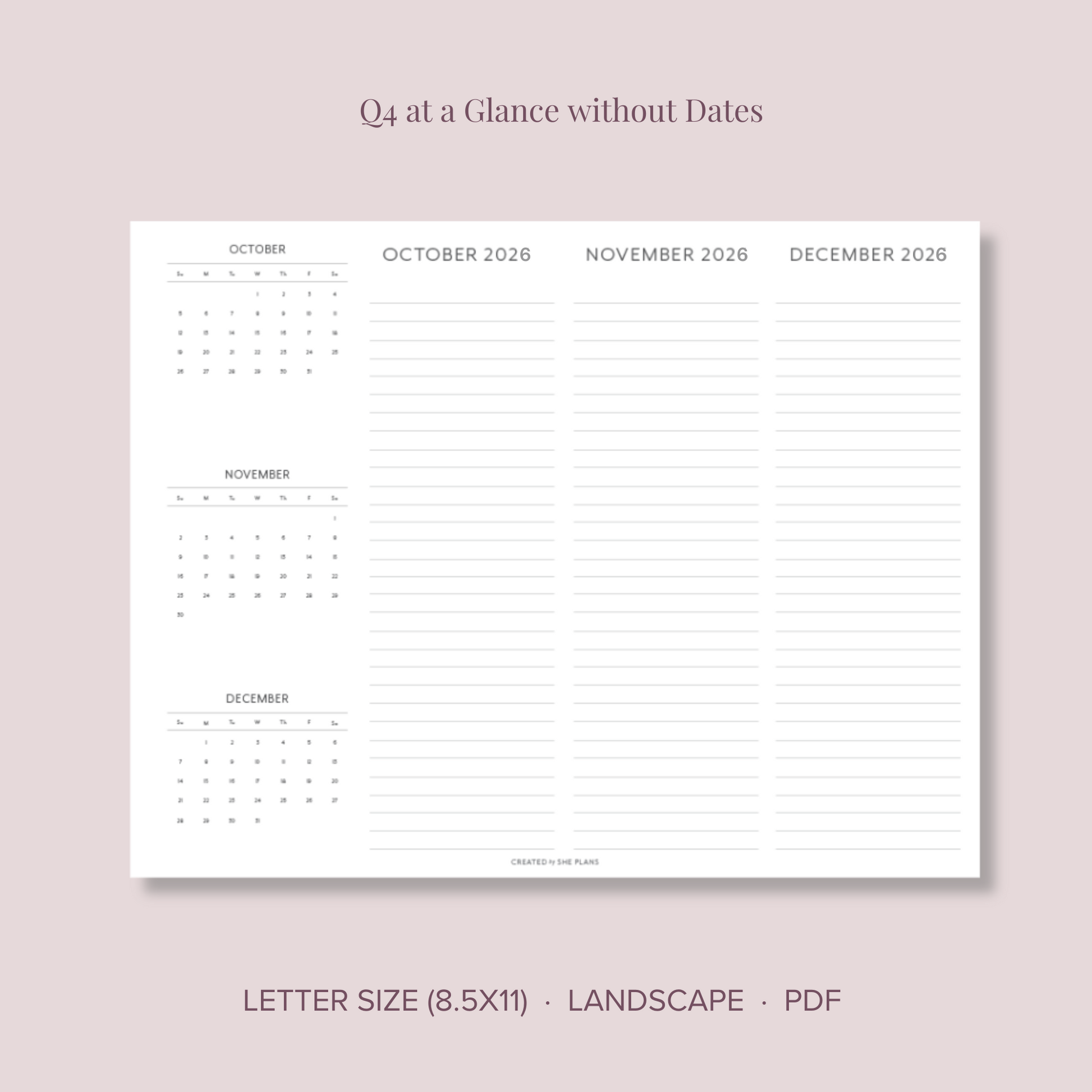 Stay organized in 2025 with this printable quarterly planner. This printable pdf allows you to easily view the quarter at a glance. Whether you choose to punch and add to your discbound planner, post it on your fridge, or just add it to your clipboard it will provide a high-level overview to help you stay on top of your quarter.