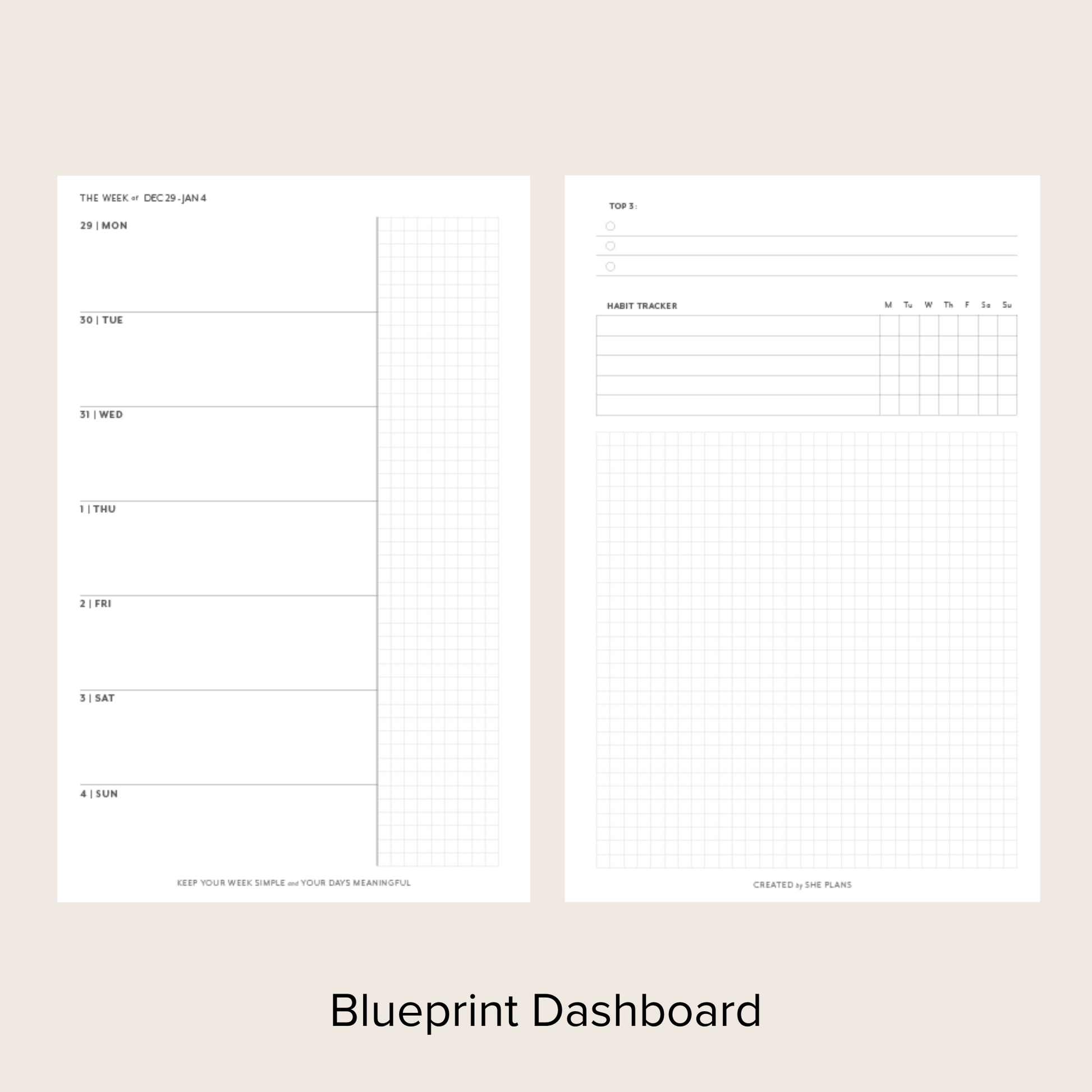The Weekly Blueprint features a clever dashboard and spacious weekly blocks, giving you all the space you need to manage your main goals while staying adaptable for whatever surprises come your way. With two weekly spreads per week, you're ready to tackle anything life throws at you with ease.
