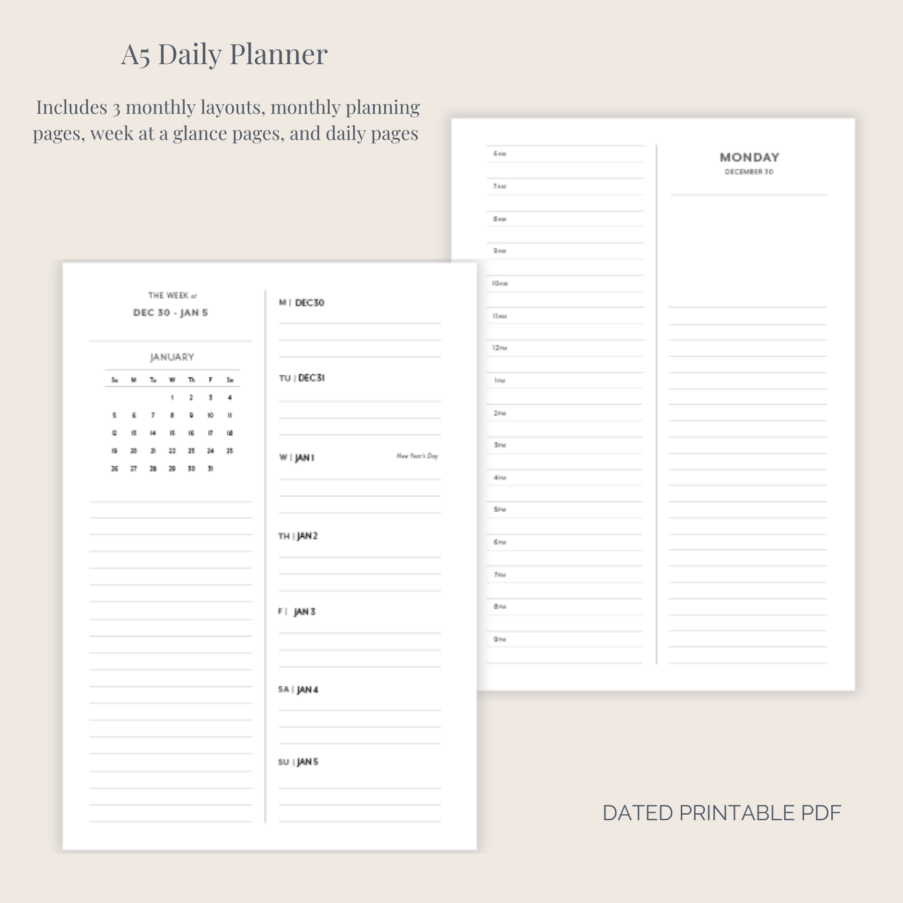 Stay organized with this A5 Daily Planner Printable. This printable is dated for quarter 1 2025, and includes a daily planner spread that you can print at home on standard letter-size paper. Plus, monthly calendar layouts and a handy week-at-a-glance page are all included. With all these features, you can maximize your productivity.