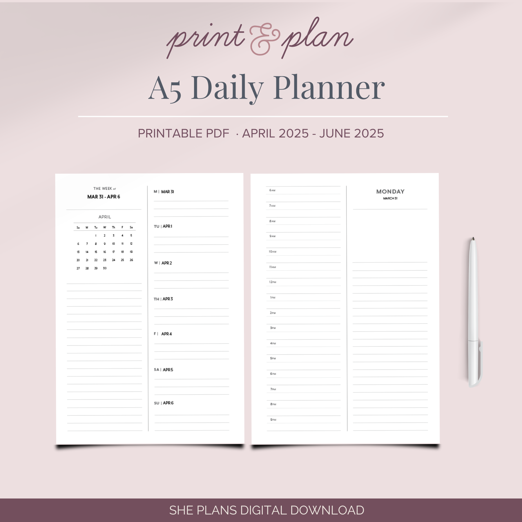 Stay organized with this A5 Daily Planner Printable. This printable is dated for quarter 2 2025, and includes a daily planner spread that you can print at home on standard letter-size paper. Plus, monthly calendar layouts and a handy week-at-a-glance page are all included. With all these features, you can maximize your productivity.