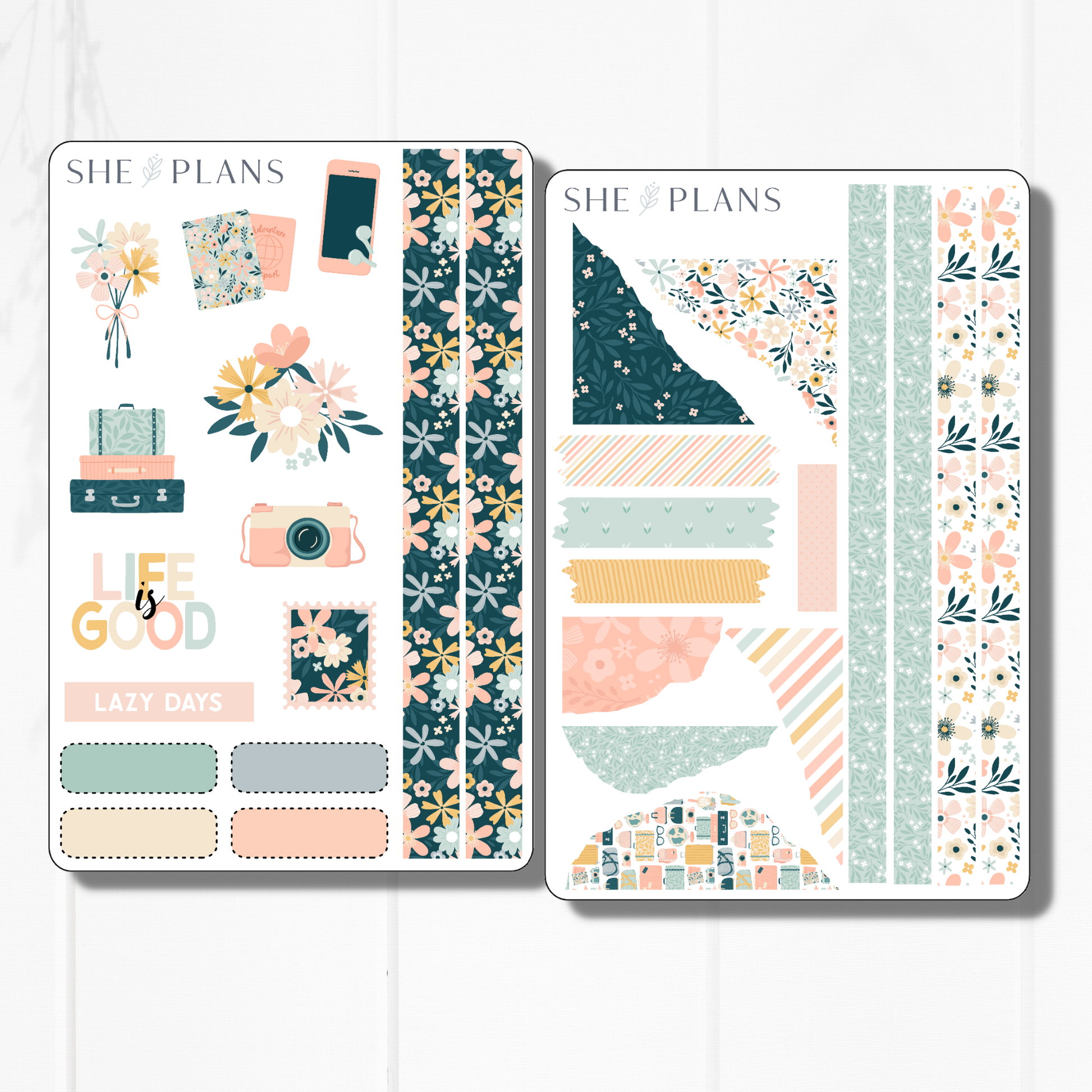 This kit includes two pages of white matte sticker sheets that come with washi strips, deco, and torn corners. It's the perfect way to add a unique touch to your undated sewn planners or any planner. Use it as a stand-alone kit to add a pop of color or combine it with any coordinating stickers or washi to personalize your planner.