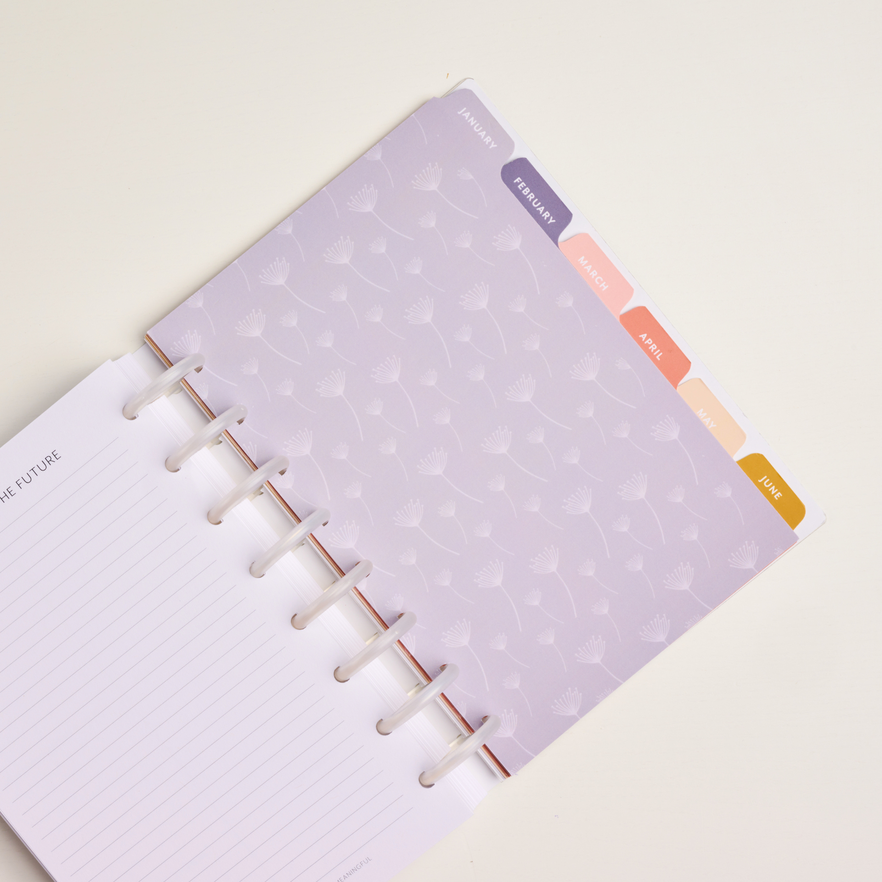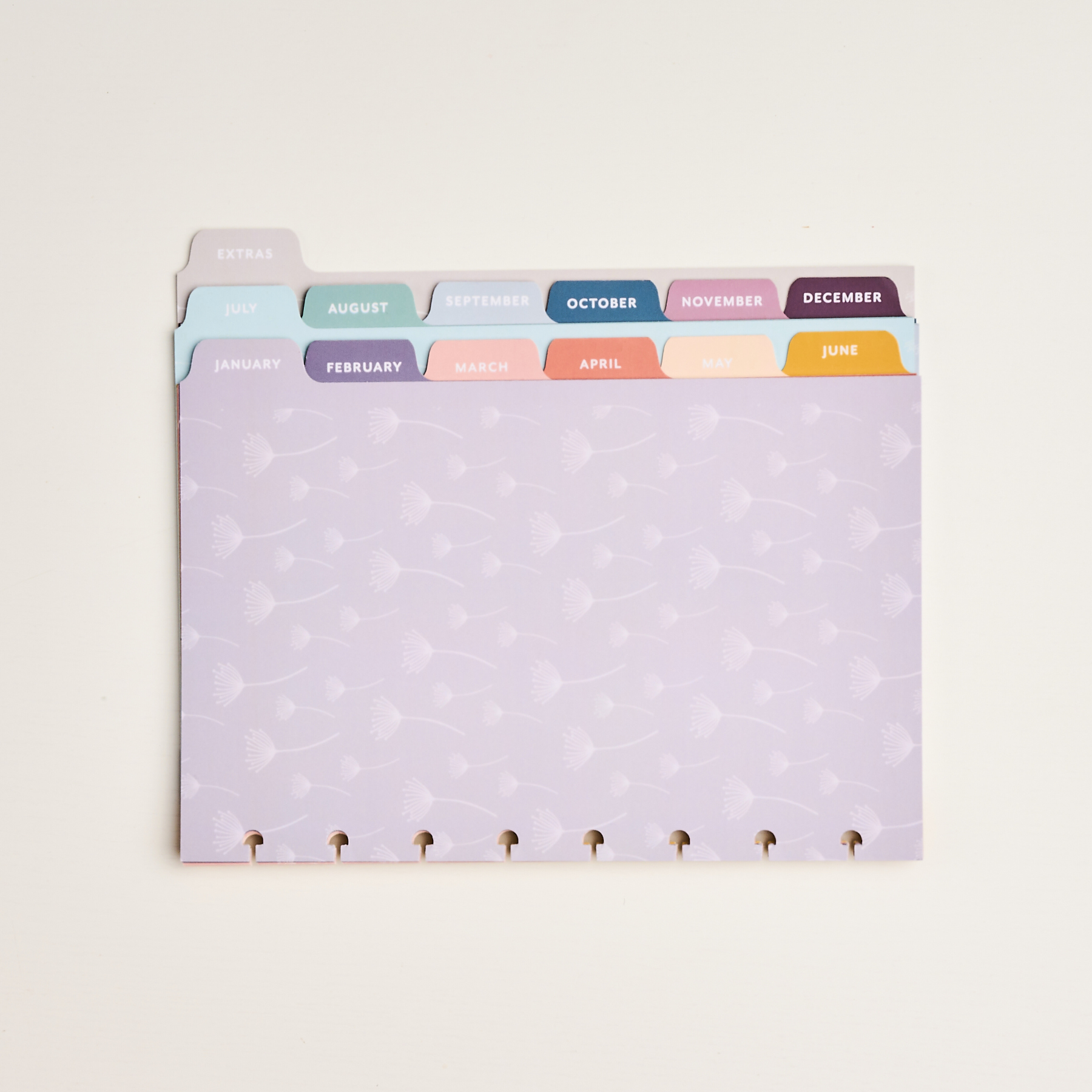 Our Monthly Divider Tabs run January through December plus an Extras tab. Quickly and easily flip between months and keep yourself organized with these beautiful, full-color designs. A must-have for every discbound planner system.