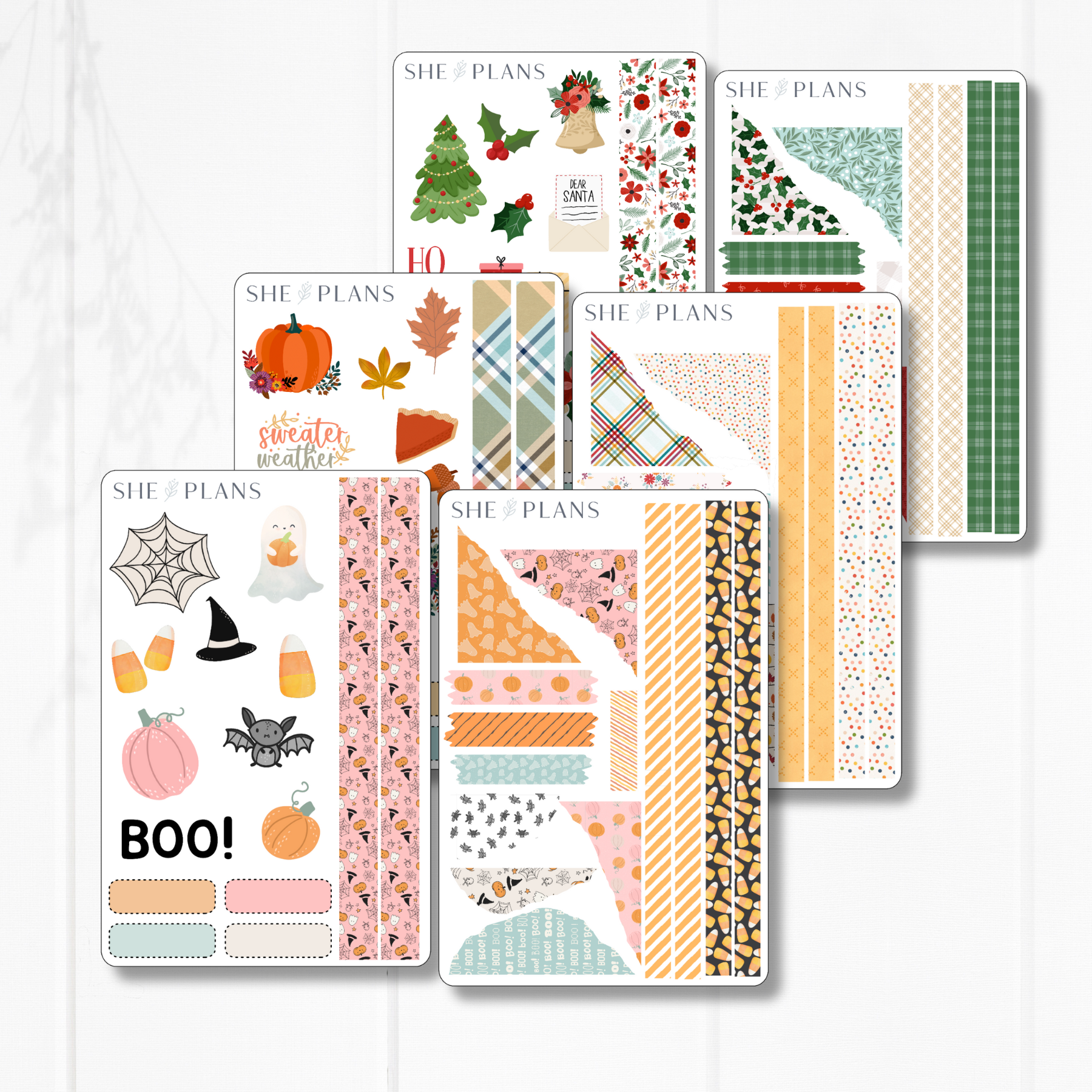 Our Sticker bundle comes with 3 months worth of stickers, each with a different monthly theme and color. You will receive 6 sheets of stickers (2 per month)