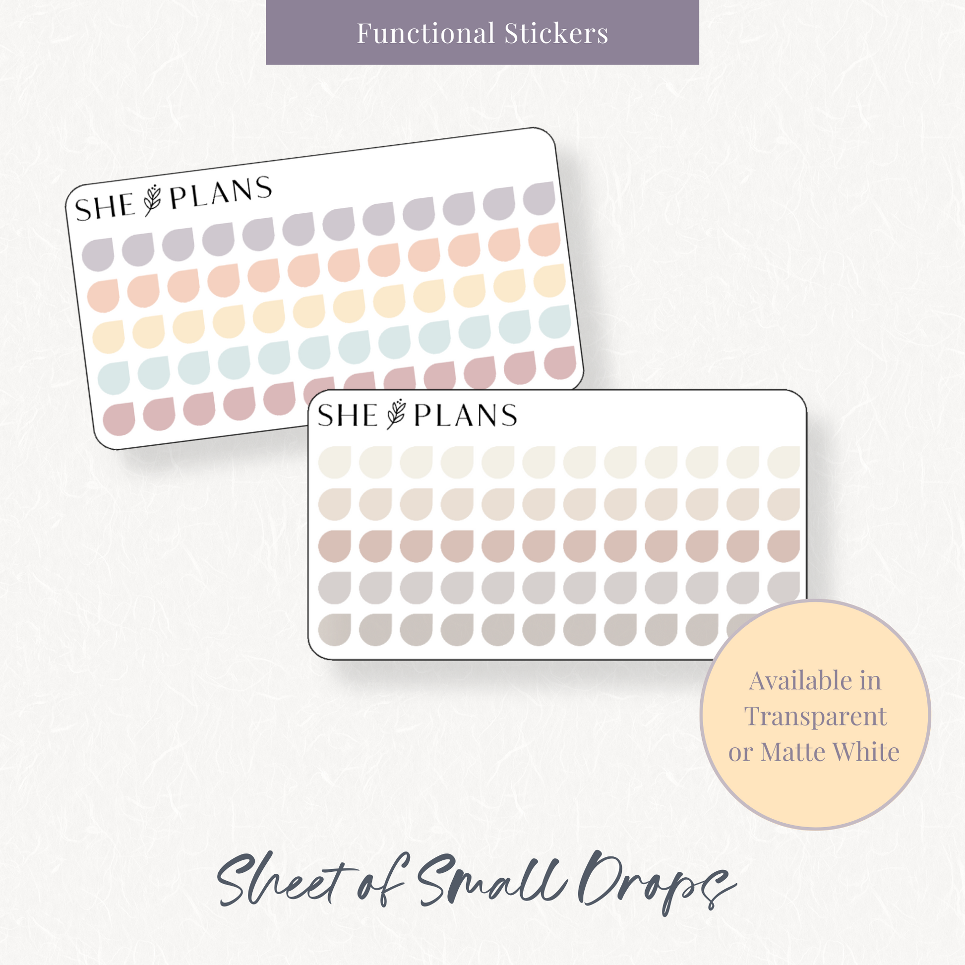 You will receive one sheet of small drop stickers. The small drops are the perfect way to catch attention and bring emphasis to important details in your planner. These stickers are versatile and can be used for many things. Plus they are not just practical, they also add pops of color to your planner spreads.