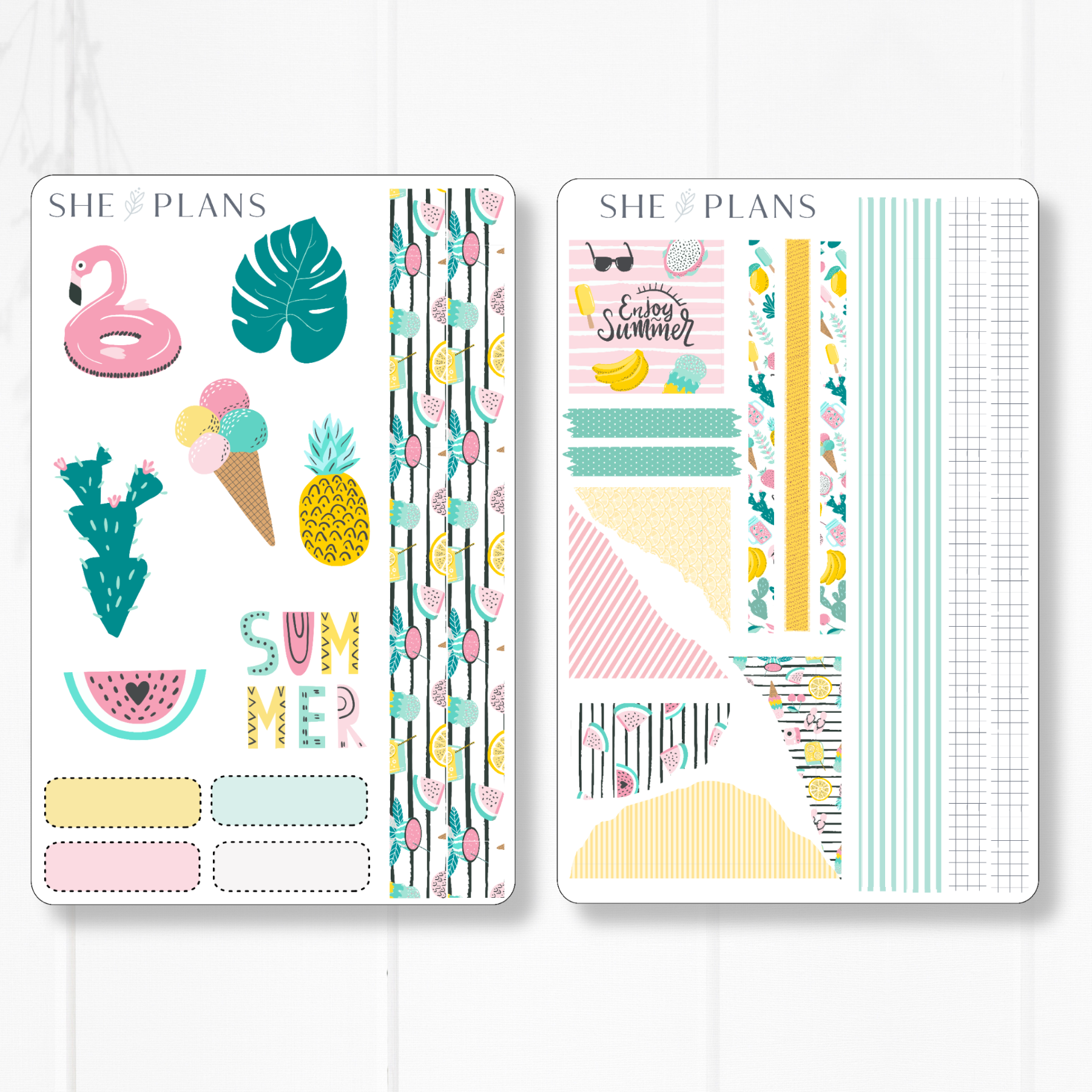 This kit includes two pages of white matte sticker sheets that come with washi strips, deco, and torn corners. It's the perfect way to add a unique touch to your undated sewn planners or any planner. Use it as a stand-alone kit to add a pop of color or combine it with any coordinating stickers or washi to personalize your planner.
