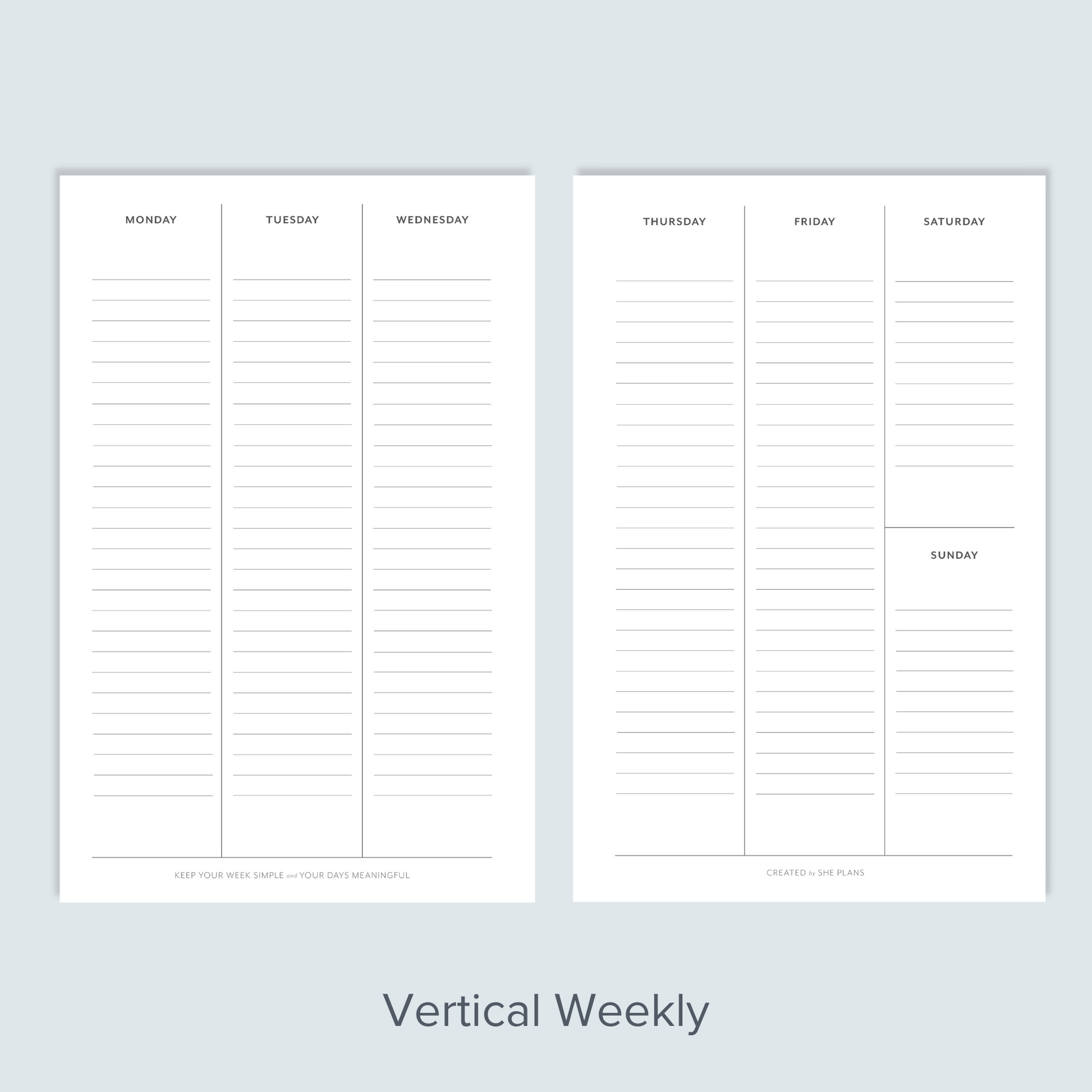 The Vertical Weekly Layout allows you to easily plan and manage your week effectively. The vertical layout allows you to divide your days into sections as well as see an overview of the week. By having a big picture of your week you are able to allocate your time and stay on top of important tasks.