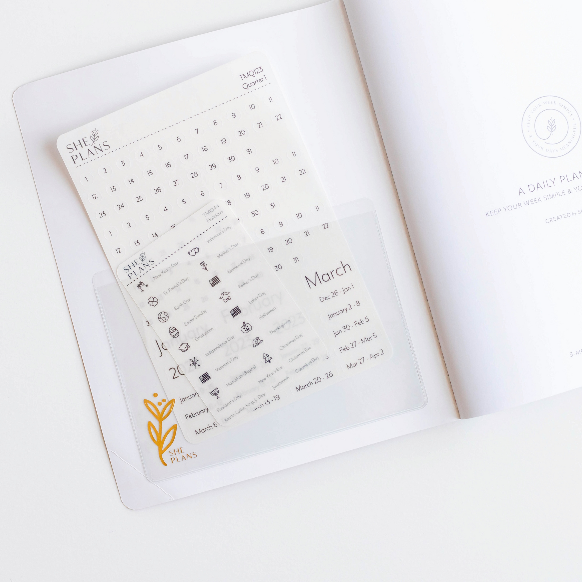 Our vinyl adhesive pocket adds some personality and functionality to any of our sewn planners. It features a gold logo and a strong adhesive backing. Perfect for holding your stickers, notes, or receipts. Simply peel and stick to the front or back cover.